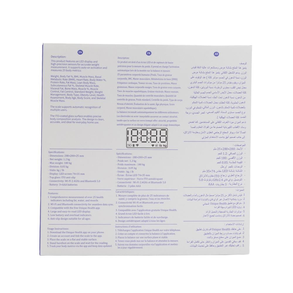 اتصال ذكي: يتزامن الميزان المزود بتقنية واي فاي بسلاسة مع تطبيق الهاتف المحمول لتتبع قياسات جسمك وتخزينها تلقائيًا.تتبع شامل: يقيس ويحلل مقاييس متعددة...